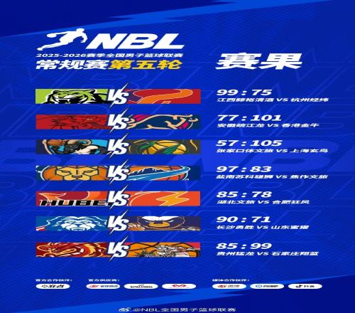 NBL常规赛第五轮今日战罢,盐南苏科雄狮97-83战胜焦作文旅,湖北文旅85-78战胜合肥狂风,长沙勇胜90-71战胜山东蜜獾,贵州猛龙85-99石家庄翔蓝。