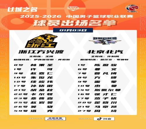 体育播报1月3日宣 CBA常规赛北京客场挑战广厦,大名单出炉,赵睿本场缺阵。