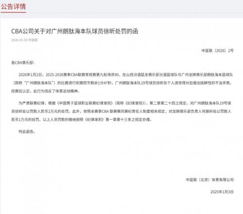 体育播报1月3日宣 CBA公司发布了关于对广州朗肽海本队球员徐昕处罚函件。