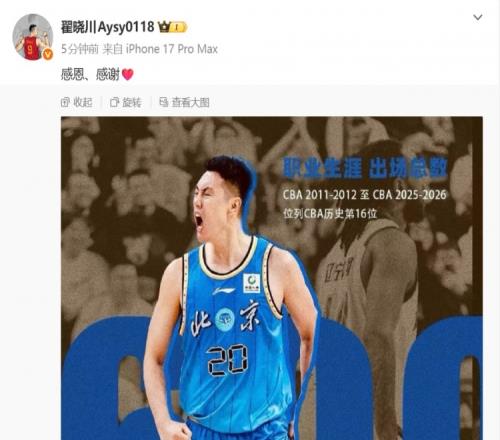 出场总数600场里程碑!翟晓川发文:感恩!感谢!