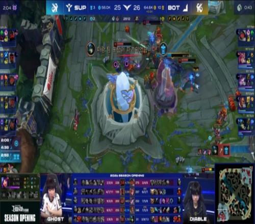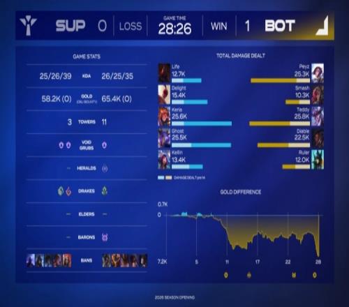 前期Keria点火佐伊线上强势单杀Teddy辛德拉,随后Keria佐伊游走,SUP队下路四包二得手,Ghost&Kellin下路主动出击却遭BOT队卢娜打出0换2。后续Diable河道单杀Ghost,BOT队持续扳回前期劣势,经济领先4k。