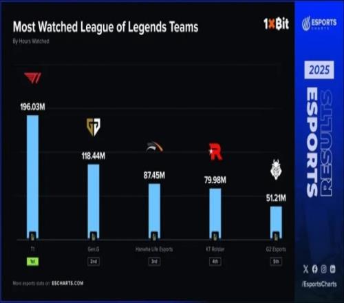 外媒统计2025英雄联盟战队收视率前五:LCK四支队伍占据前四