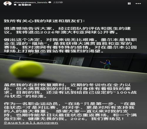 体育播报01月08日宣 郑钦文在个人社媒宣布,经过团队评估和医生建议,她将退出2026年澳网。