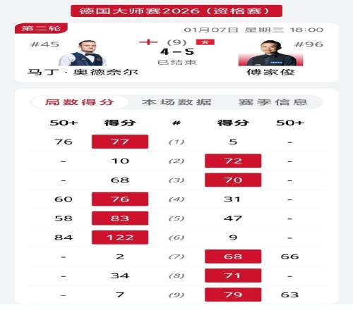 傅家俊在2-4后连拿三局,最终拿下对手。