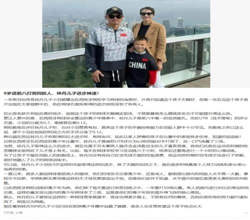 体育播报01月06日宣 近日有自媒体称林丹和谢杏芳的儿子9岁网球进前八打哭同龄人,今日谢杏芳做出了辟谣。