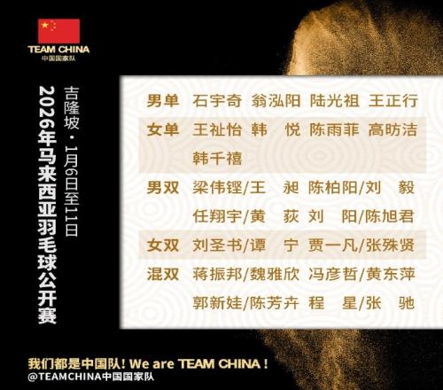 体育播报1月5日宣 2026年马来西亚羽毛球公开赛将于1月6日至11日在吉隆坡举行,今日中国羽毛球队公布参赛名单。石宇奇、陈雨菲、凤凰组合领衔。