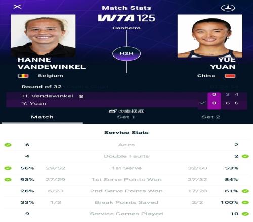 WTA125堪培拉站女单首轮:袁悦20横扫范德温克尔,收获开门红