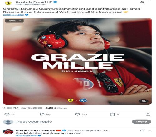 北京时间1月2日下午,法拉利F1车队在其官方社媒发文,感谢周冠宇过去一年作为替补车手的付出,祝愿他未来顺利。周冠宇在其下留言道:“谢谢!祝一切顺利,下次见!”