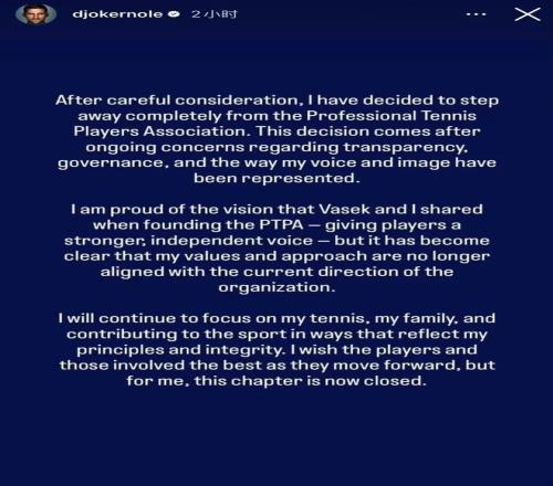“经过慎重考虑,我决定彻底退出职业网球运动员协会(PTPA),这一决定源于我对协会透明度、运作模式以及我的声音和形象的呈现方式的持续担忧。”