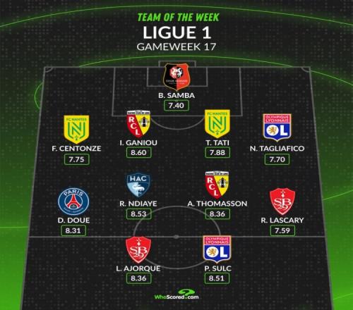中场:杜埃(巴黎,8.31分)、拉索尔·恩迪亚耶(勒阿弗尔,8.53分)、阿德里安·托马森(朗斯,8.36分)、雷米·拉博·拉斯卡里(布雷斯特,7.59分)