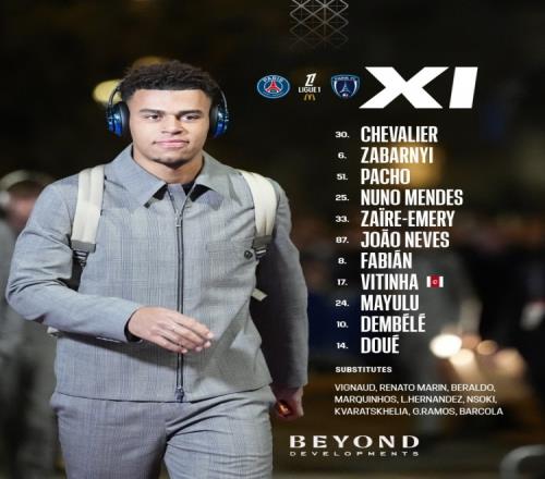 30-舍瓦利耶、6-扎巴尔尼、51-帕乔、25-努诺·门德斯、33-扎伊尔·埃梅里、87-若昂·内维斯、8-法比安·鲁伊斯、17-维蒂尼亚、24-马尤卢、10-登贝莱、14-杜埃