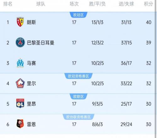 朗斯积40分排名法甲榜首,巴黎圣日耳曼积39分位居次席,据Opta统计,同一个赛季两支球队17轮过后积分39+,本世纪法甲第三次出现这样的情况,此前两次是2016-2017赛季、2022-2023赛季。