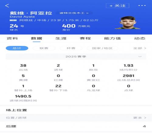 戴维·阿亚拉位置为防守中场,现效力于美职联波特兰伐木工俱乐部。德转身价400万欧。2025赛季代表波特兰伐木工出场38次,2球1助。