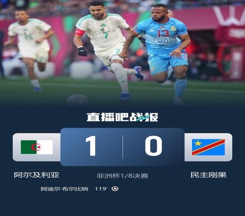 体育播报1月7日宣 北京时间1月7日0点,非洲杯八分之一决赛,阿尔及利亚对阵民主刚果。上半场,两队都没有创造出有威胁的机会。下半场,本纳塞尔伤退,两队依旧未能完成破门。加时赛,布尔比纳替补登场破门绝杀。最终阿尔及利亚1-0淘汰民主刚果晋级八强,阿尔及利亚将在四分之一决赛中对阵尼日利亚。