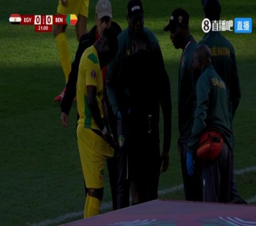 体育播报01月06日宣 埃及vs贝宁第22分钟,贝宁前锋艾耶根在场边拉开裤子,场边队医等人在围着看,之后他在场边换了裤子。
