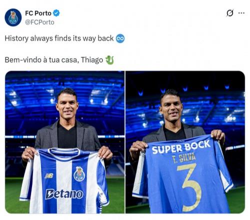 41岁巴西中卫蒂亚戈·席尔瓦免签回归波尔图,俱乐部官方社媒晒出他在主场手拿球衣亮相的照片。