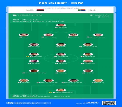 体育播报12月26日宣 北京时间周五晚23点,非洲杯小组赛B组第二轮焦点战,埃及vs南非,赛前双方公布首发阵容。