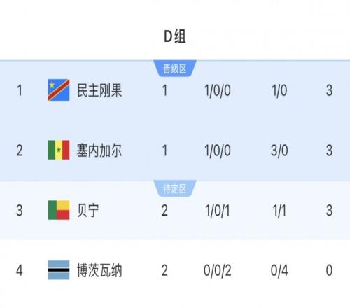 非洲杯D组积分榜:三队同积3分!贝宁取首胜博茨瓦纳两轮丢4球