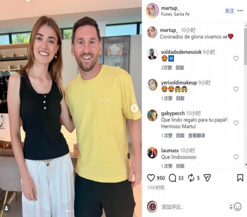 玛蒂娜与正在度假的梅西夫妇相遇,并获赠梅西的签名球衣,她在社交媒体上晒出与梅西、安东内拉的合照,安东内拉身穿印有梅西亲吻大力神杯照片的T恤。