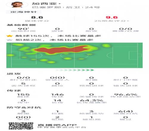 埃里克加西亚本场数据:3解围,3抢断,4成功对抗,评分8.5分