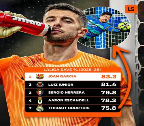 根据数据统计,霍安·加西亚在西甲扑救成功率83.3%为联赛最高,位居二三四位的是路易斯·朱尼尔(比利亚雷亚尔,81.4%)、塞尔吉奥·埃雷拉(奥萨苏纳,79.8%)以及埃斯坎德尔(皇家奥维耶多,78.3%),皇马门将库尔图瓦以75.8%位居第7位。