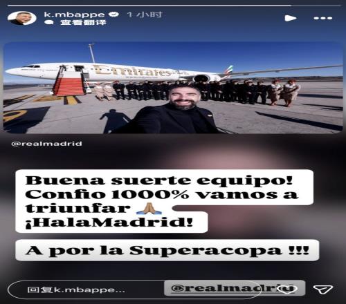 姆巴佩写道:球队好运!我1000%相信我们会取胜的,加油皇马!