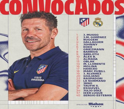 马竞西超杯对阵皇马名单:阿尔瓦雷斯、格列兹曼、科克领衔