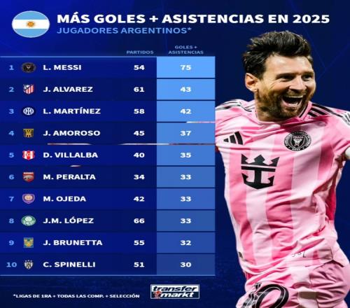 2025年阿根廷球员参与进球榜:梅西75球居首,小蜘蛛43球次席
