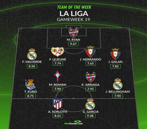 中场:久保建英(皇家社会,8.75分)、米格尔·罗曼(塞尔塔,7.99分)、凯文·阿里亚加(莱万特,7.95分)、裘德·贝林厄姆(皇家马德里,7.90分)