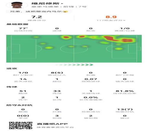 维尼修斯本场8过人5成功13对抗7成功+3犯规2造犯规获评7.2分