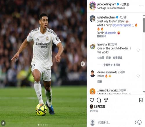 贝林厄姆社媒晒照:很棒的方式开启2026年,贡萨洛帽子戏法够精彩