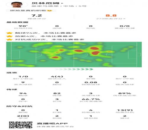 贝林厄姆本场1射0正+3关键传球4抢断+15对抗9成功获评7.2分
