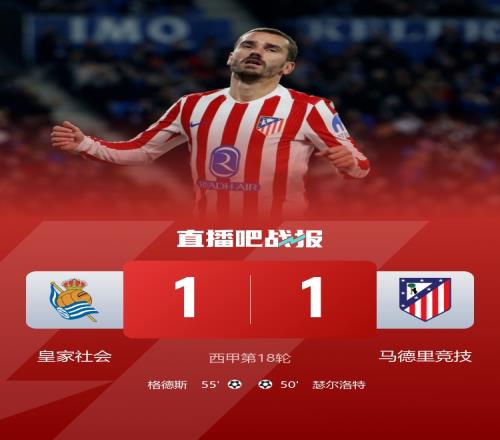 体育播报1月5日宣 北京时间1月5日凌晨4时整,2025-26赛季西甲第18轮在阿诺塔球场展开角逐,马德里竞技客场对阵皇家社会。上半场瑟尔洛特乌龙越位无效,下半场瑟尔洛特先拔头筹,小西蒙尼助攻,格德斯扳平,久保建英助攻。最终马竞客场1-1战平皇家社会,马竞各赛事4连胜终结,积38分仍居第4+距榜首巴萨11分,皇社联赛5轮不胜。