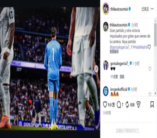 库尔图瓦社媒:青训球员的进球带来胜利,贡萨洛表现太棒了