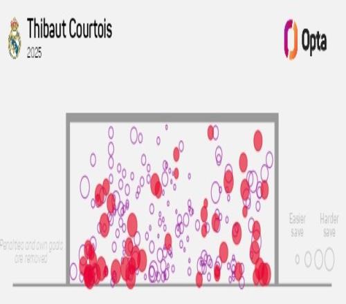 Opta指出,库尔图瓦2025年各赛事扑救174次,五大联赛门将同期扑救次数最多。