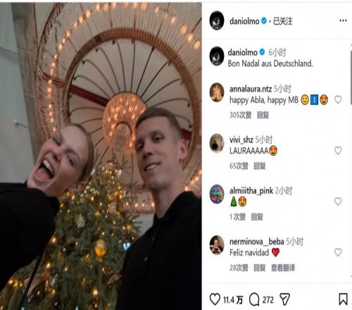 他晒出了一张与女友在圣诞树前的搞怪自拍,并用加泰语以及德语写道:“来自德国的圣诞快乐”。