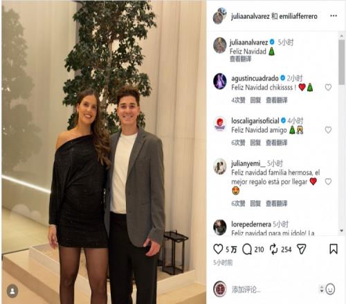 阿尔瓦雷斯与女友艾米莉亚共度圣诞节,他在社交媒体上晒出合照,配文:“圣诞快乐!”
