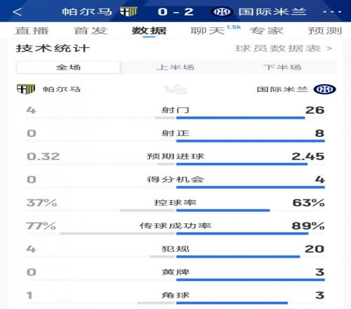 国米20帕尔马全场数据:射门264,射正80,得分机会40