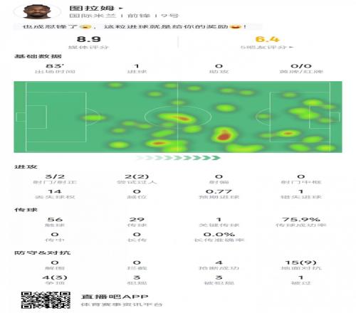 图拉姆本场数据:3次射门打进1球,19次对抗12次成功,获评8.9分