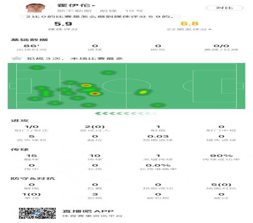 那不勒斯的首发前锋霍伊伦本场媒体评分只有5.9,是球队出战球员里面最低的。他本场比赛仅1脚射门,但3次犯规是全场最多的。