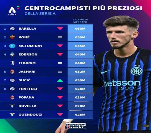 意甲中场中路球员身价榜:巴雷拉6000万欧居首,科内、小麦前三