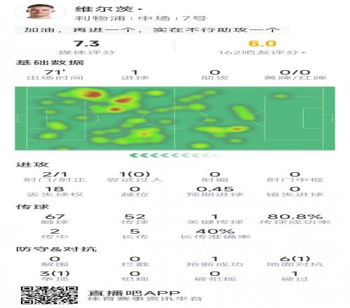 维尔茨本场数据:1粒进球,2射1正,1次关键传球,9对抗仅2成功
