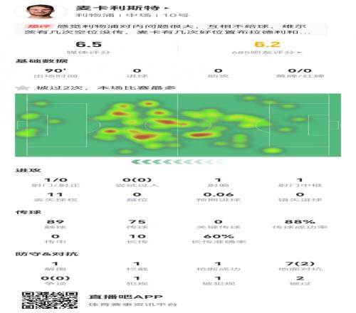 麦卡利斯特本场1射0正1中框10长传6成功+7对抗2成功获评6.5分