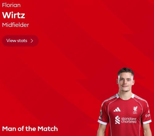 英超生涯第2球,英超官方:维尔茨当选利物浦22富勒姆全场最佳