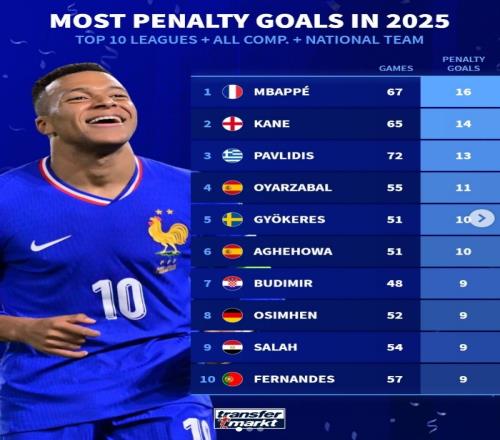 2025年各项赛事点射进球榜:姆巴佩居首,凯恩次席,约克雷斯在列