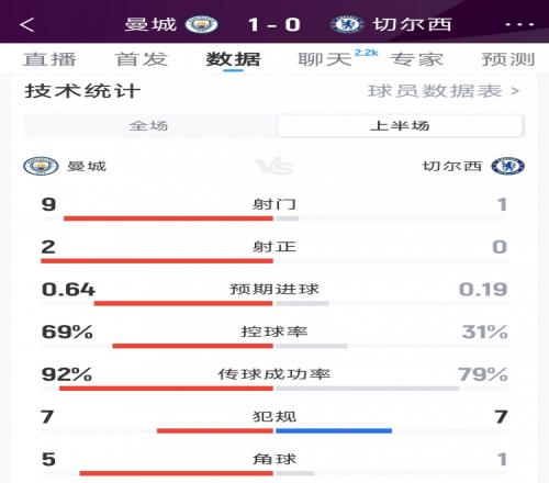 曼城10切尔西半场数据:射门91,射正20,角球51