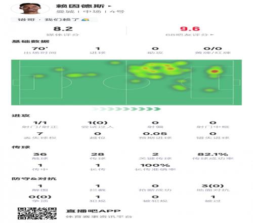 赖因德斯本场数据:1进球2关键传球1解围1拦截,评分8.2
