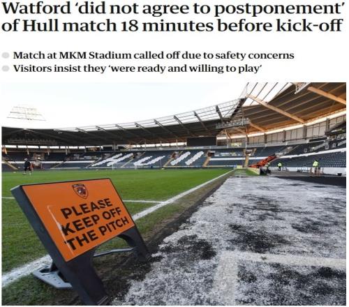 体育播报1月5日宣 《卫报》报道,赫尔城赛前18分钟通知比赛取消,沃特福德声明抗议。