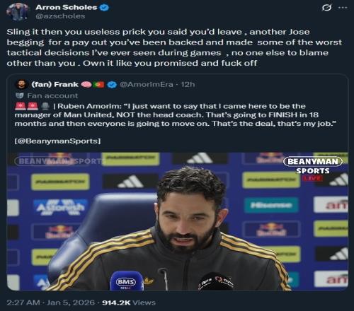 体育播报1月5日宣 曼联名宿斯科尔斯的大儿子阿隆·斯科尔斯今天在推特发文,怒喷曼联主教练阿莫林。