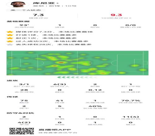 库尼亚本场3射1正进1球+1中框28丢失球权+15对抗6成功获评7.3分